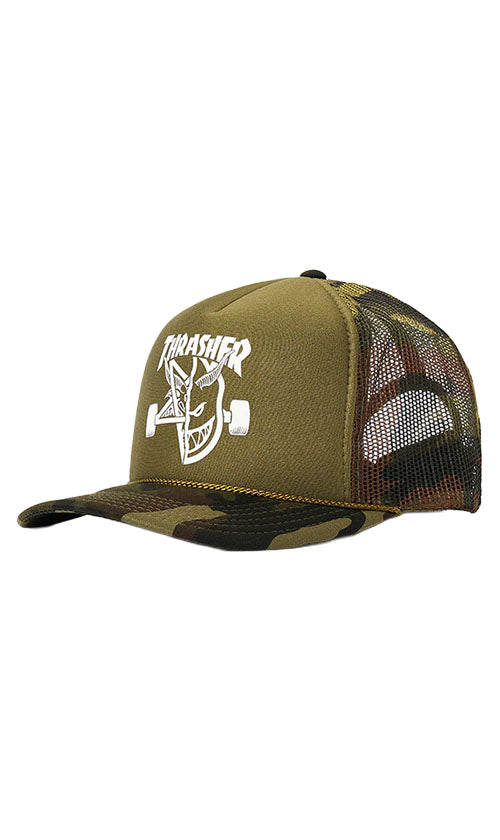 Thrasher x Spitfire Thrash & Burn Trucker Cap is a typical go-to trucker-style hat, with Thrasher x Spitfire branding on the centre of the front-facing panel
