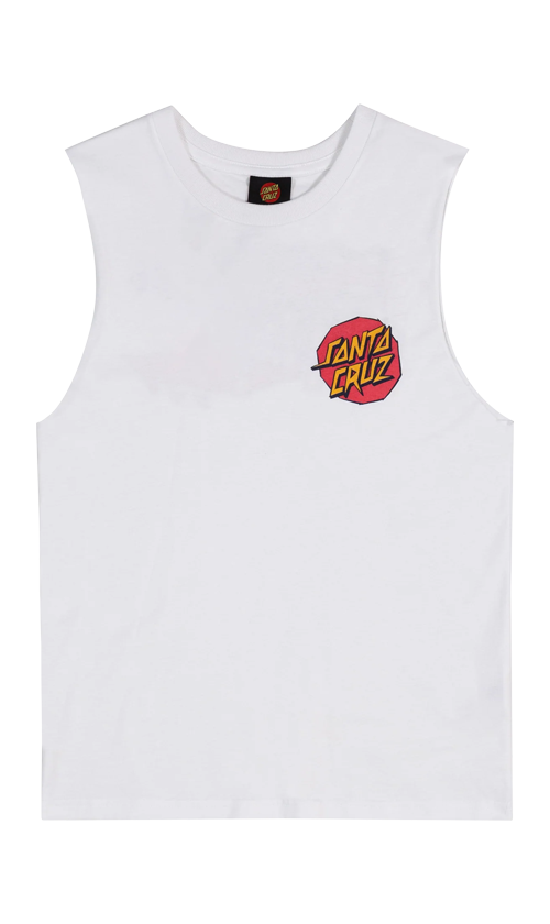Santa Cruz Meek Scratched Youth Muscle Tee in classic white. Featuring the iconic Meek graphic. Cut as a sleeveless muscle tee, it's perfect for warm weather. Comfortable cotton construction keeps you cool while you skate. A timeless piece that works both on and off the board.